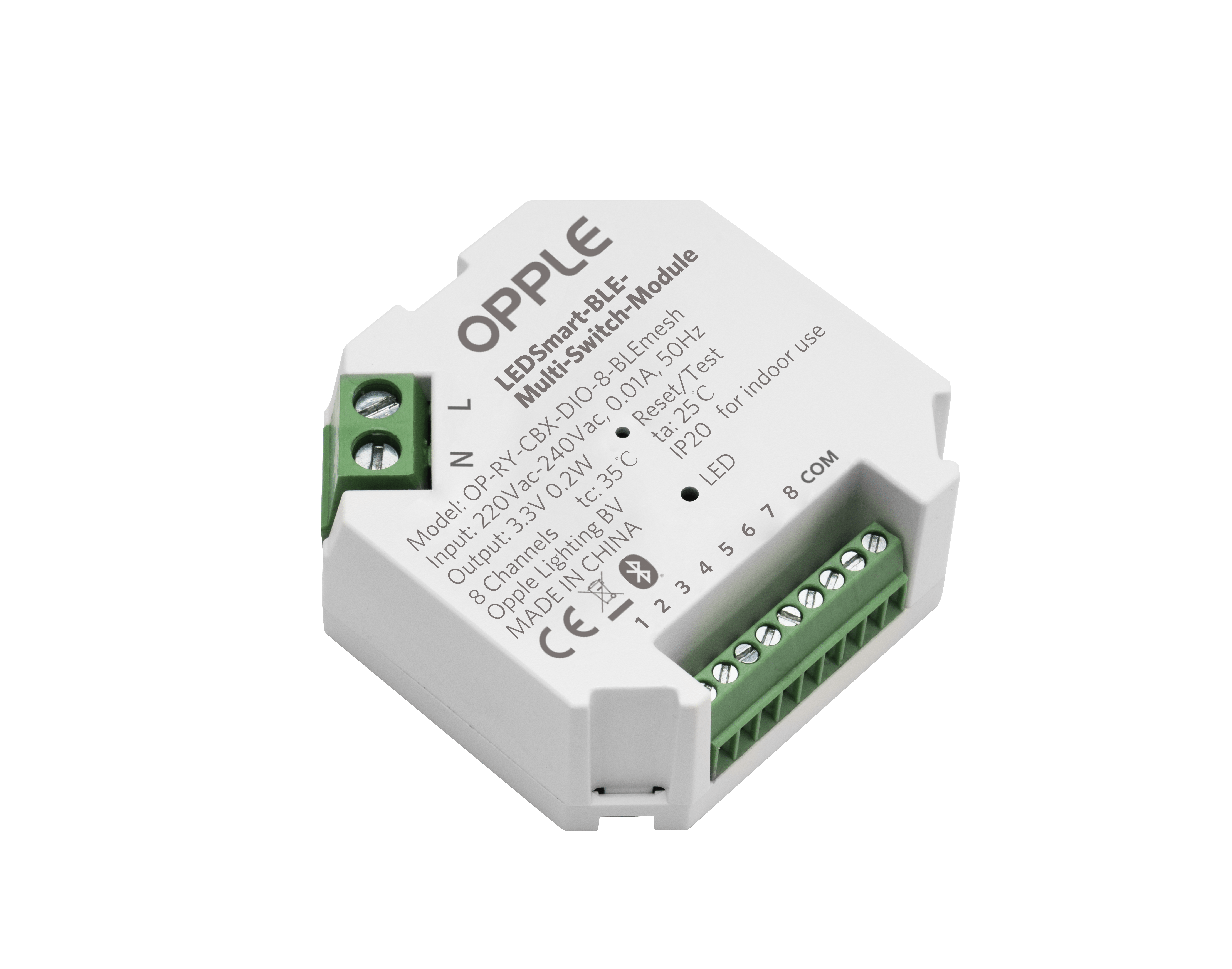Compacte ingangsmodule voor gebruik in het OPPLE Smart Lighting Systeem. Maakt het gebruik van conventionele drukknopschakelaars mogelijk om Smart armaturen aan te sturen. Schakel Smart armaturen aan/uit, dim+/-, CCT+/- en activeer scènes met een druk op een knop. Zeer eenvoudig in te stellen met de OPPLE Smart Lighting App, of Smart Connect Box via de web user interface. Volledig draadloze communicatie via Bluetooth® Low Energy (BLE). Klein genoeg om achter de wandschakelaar te installeren.
